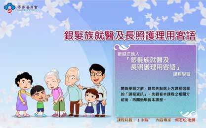以「銀髮族就醫」以及從事「長期照護」的護理人員常需使用的會話為主題,先透過情境案例動畫的方式帶出常用的客語會話,再針對這些會話的用法及詞彙進行教學。