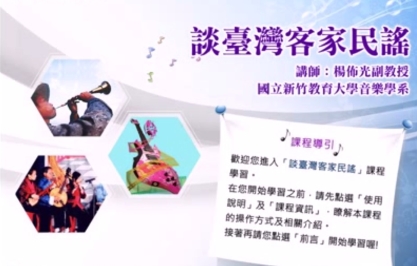 目前在臺灣,客家民謠分為南、北兩區,南部以「美濃」為名之山歌調著稱,北部以三大調 (老山歌、山歌仔、平板) 及小調傳世…,本課程將逐一探討之。