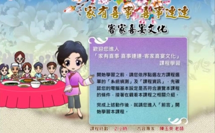 由三位故事主人翁,帶領學習者了解客家婚宴和壽宴的文化意涵及語文應用,藉由動畫及練習的呈現,加深學習者的學習動機及學習成效,更進一步了解客家對喜慶的傳統觀念。
