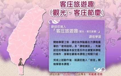 本課程從文化觀光的定義與節慶、生活入手,依續介紹客庄十二大節慶中具代表性與文化意義的節慶,此外也提供相關文化景點說明與介紹。